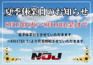 今月8/13〜8/16まで夏季休暇となっております。休暇前ラストの車両を現在施工中!!
