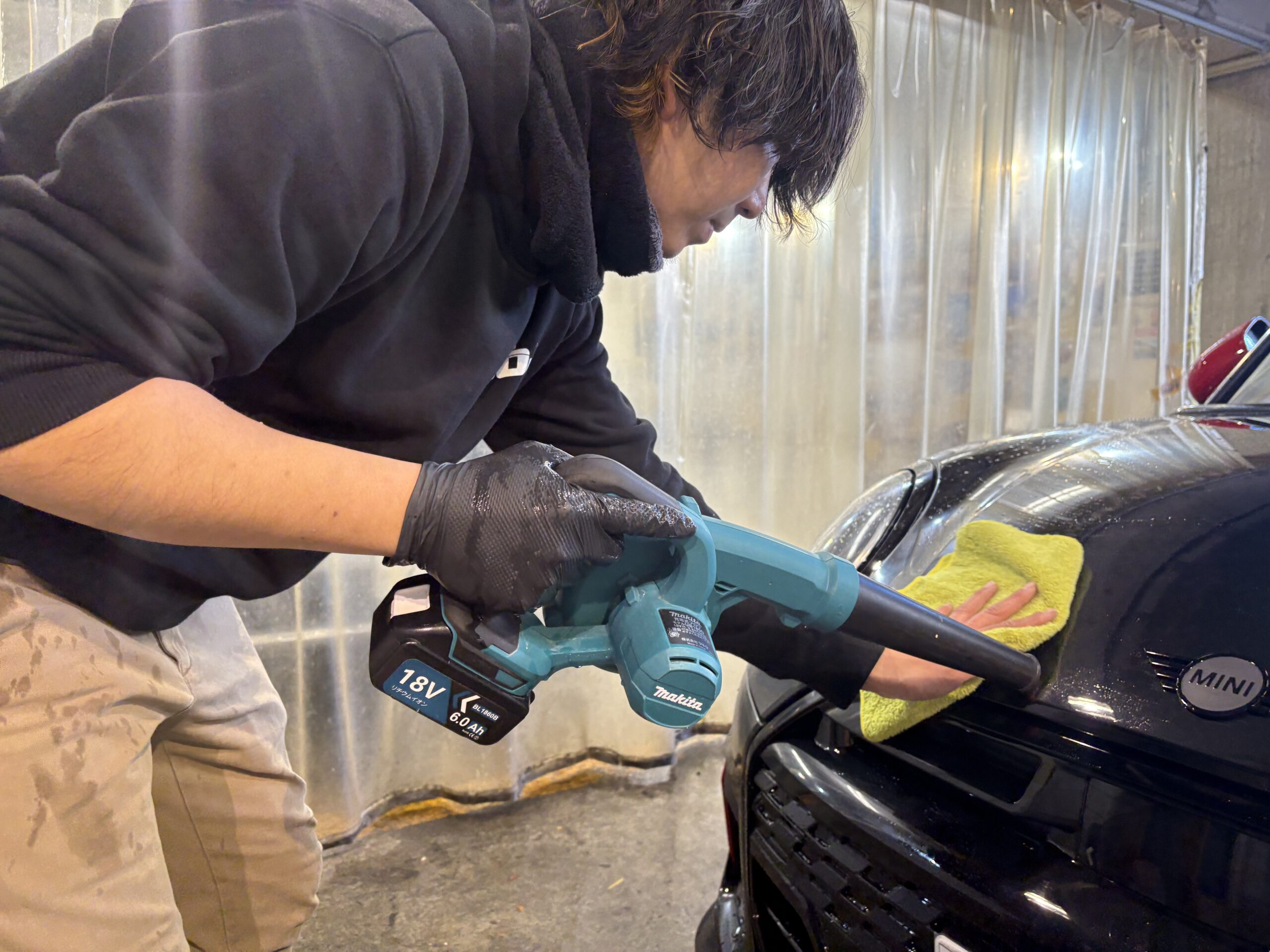 最後は、仕上げ作業!流した水や細かい汚れを隅々までブロワーと濡れたウエスを使用して拭き上げていきます。ボディー部分には、NOJオリジナルのメンテナンス・オーバーコートを使って弱撥水性と防汚性を高める溶剤で丁寧に仕上げていきます。