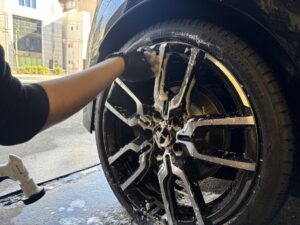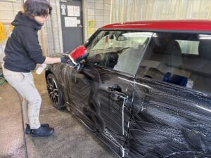 まずは、全体を手洗い洗車。塗装にキズがつかない様に優しく丁寧に洗っていきます。
