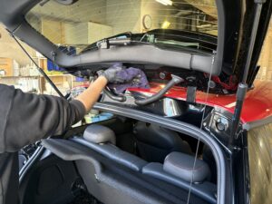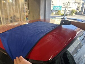 更に、NOJリザレクション(水垢除去剤)を使ってボディーに着いた水垢を分解していきます。垢が溜まりやすいルーフ・ボンネットはオーバンウエスを使って水気を取りリザレクションの効果を最大限まで引き上げます。