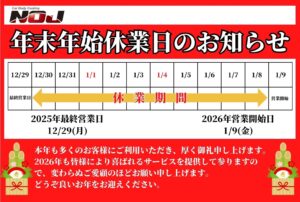 誠に勝手ながら12/30〜1/8までの期間が休業となっております。1/9〜通常営業を開始いたしますので、皆様来年度も宜しくお願い致します。