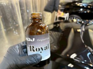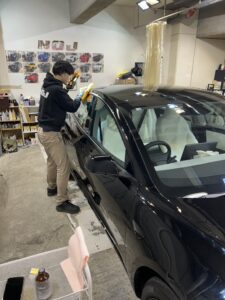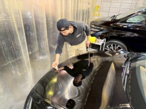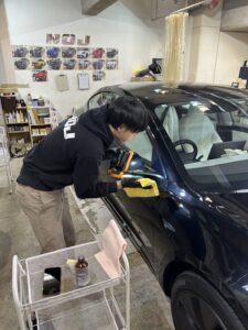 研磨後は全体を脱脂し、ボディコーティングを施工していきます!照明を当ててチェックしながらパネルごと慎重に作業します。今回のモデル3はNOJロイヤルコーティングの3層施工✨✨✨多層して膜の強度を上げ、さらに艶感もアップさせていきます!