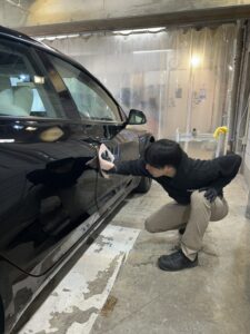 下準備で塗装表面を綺麗にし、ブース内でマスキングテープを使った養生作業をしていきます。研磨をしないパーツを保護する為の重要な作業です!