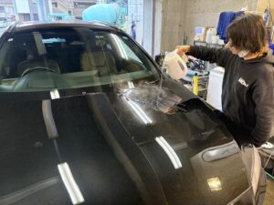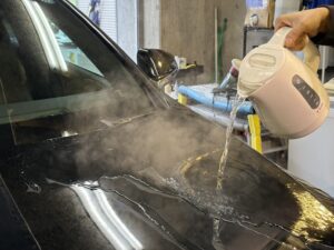 この時期ボディ上に付着して取れない花粉シミは熱を加えて除去します。今回ボンネットに所々見受けられたので、熱湯処理いたしました✨