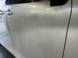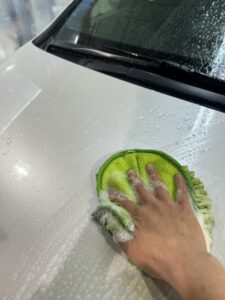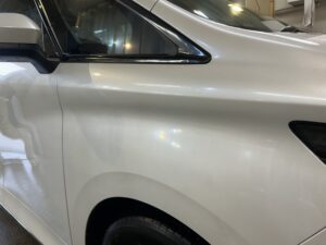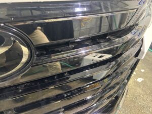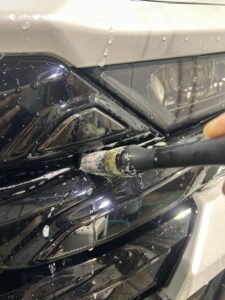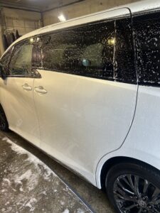 写真で分かるようにボディには水垢汚れ、細かな隙間にも汚れの塊が付着している状態です。特にヴェルファイアのようにフロントグリルが細かい車両はこう言った箇所も汚れが目立ちます🤔